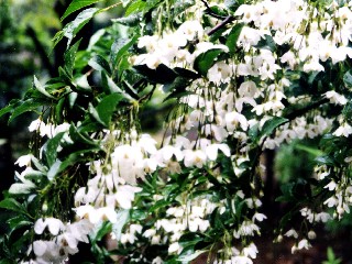 | 公園に植えられたり、山野にと思っていたが、最近時々岡山市の庭木で見かける。岡山県立図書館で撮影。 | 落葉小高木4mから5mになり初夏白い花を多数下垂してつける。ヤマボウシより花は小ぶり。5弁花。 |
