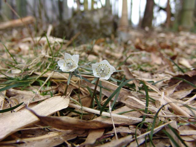 | セツブンソウは早春、早いものでは「節分」の頃から咲き始める。 岡山県内でも美作市田殿〔たどの〕・河会〔かわい〕、岡山市紙工〔しとり〕、建部町、高梁市布寄〔ふより〕、新見市豊永〔とよなが〕等多くの自生地がある。 ほとんどの場所が北向きの方向にあって、南斜面の自生地は数少ない。 自生地の大半が、神社の境内、墓地の近く、栗林の下と普段から人が手を入れて管理しているところが多く、草ぼうぼうと荒れ放題の場所ではほとんど見られない。 人が、農耕をして家の近くの草刈をしたり、栗を拾うために下草を刈ったりして環境を整えているところにしか残っていないのが現状で、今後も人の手を借りながらお返しとして美しい姿を見せてくれるであろう。 |
